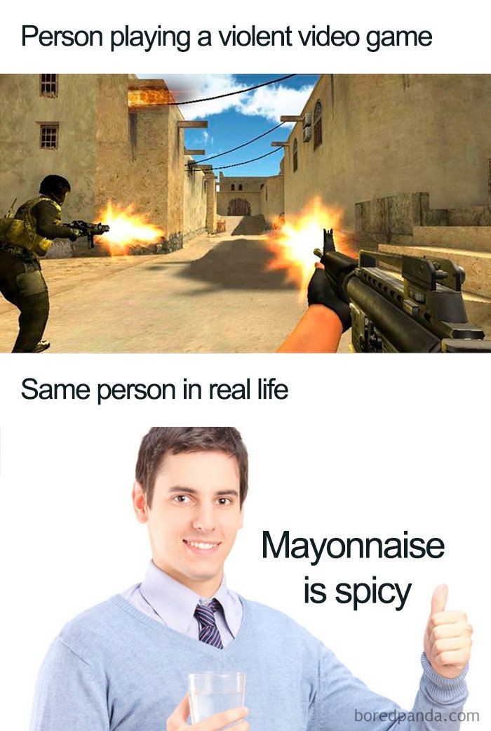 Dalam meme ini, para gamer yang memainkan video game tembak-tembakanΒ disebut sebagai sosok yang biasanya baik-baik saja di dunia nyata. (Foto: via Boredpanda.com)