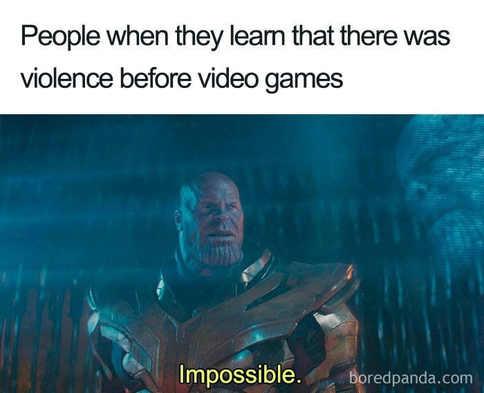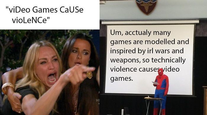 Banyak video game disebut sebagai perwujudanΒ dan terinspirasi dari peperangan. Artinya, secara teknis, meme ini menganggap kekerasan-lah yang melahirkan video game.Β (Foto: via Boredpanda.com)