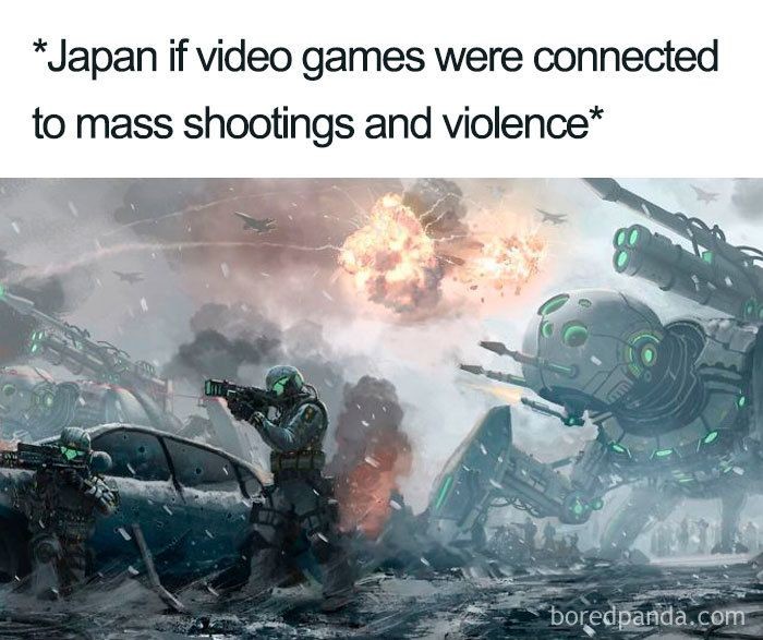 Industri video game amat berkembang di Jepang. Kalau analoginya video game memicu kekerasan, di Negeri Sakura pastiΒ perang terus. Demikian meme ini melakukan sindiran.Β (Foto: via Boredpanda.com)