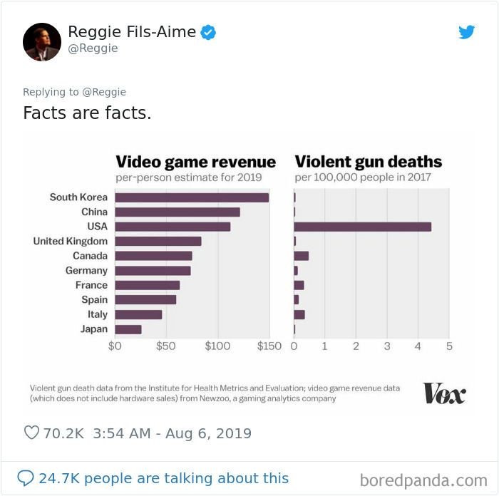 Meme ini mengutip sebuah data mengenai revenue video game berdasarkan negara, yang ternyata tidak memiliki korelasi langsung dengan tindak kekerasan di negara tersebut. (Foto: via Boredpanda.com)