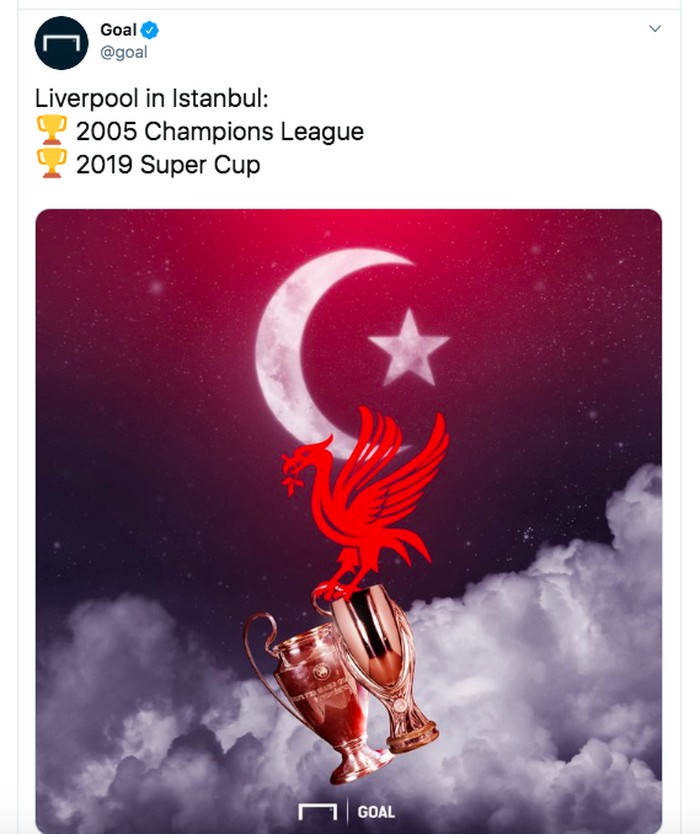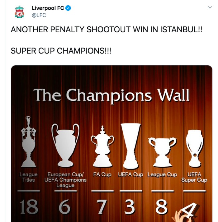 Kami cinta Istanbul, begitu tulis akun resmi Liverpool di Twitter usai menang adu penalti lawan Chelsea dan menggondal piala Super Eropa. Foto: istimewa