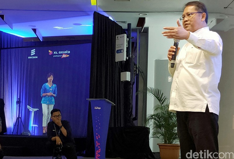 Direktur Teknologi XL Axiata, Yessie D, Yosetya ( kiri, dalam bentuk hologram ) menyapa Menteri Komunikasi dam Informatika RI, Rudiantara dan Presiden Direktur & CEO XL Axiata, Dian Siswarini dalam acara Uji Coba Teknologi 5G dan Fiberisasi Jaringan di Jakarta, Rabu (21/8).