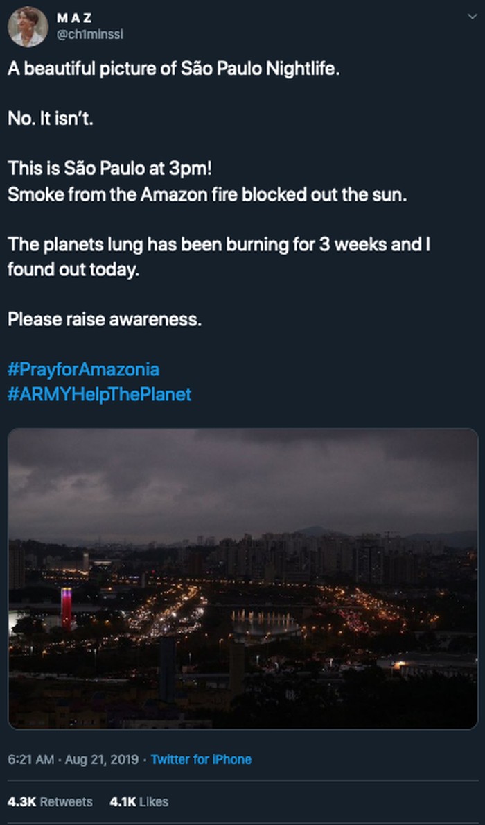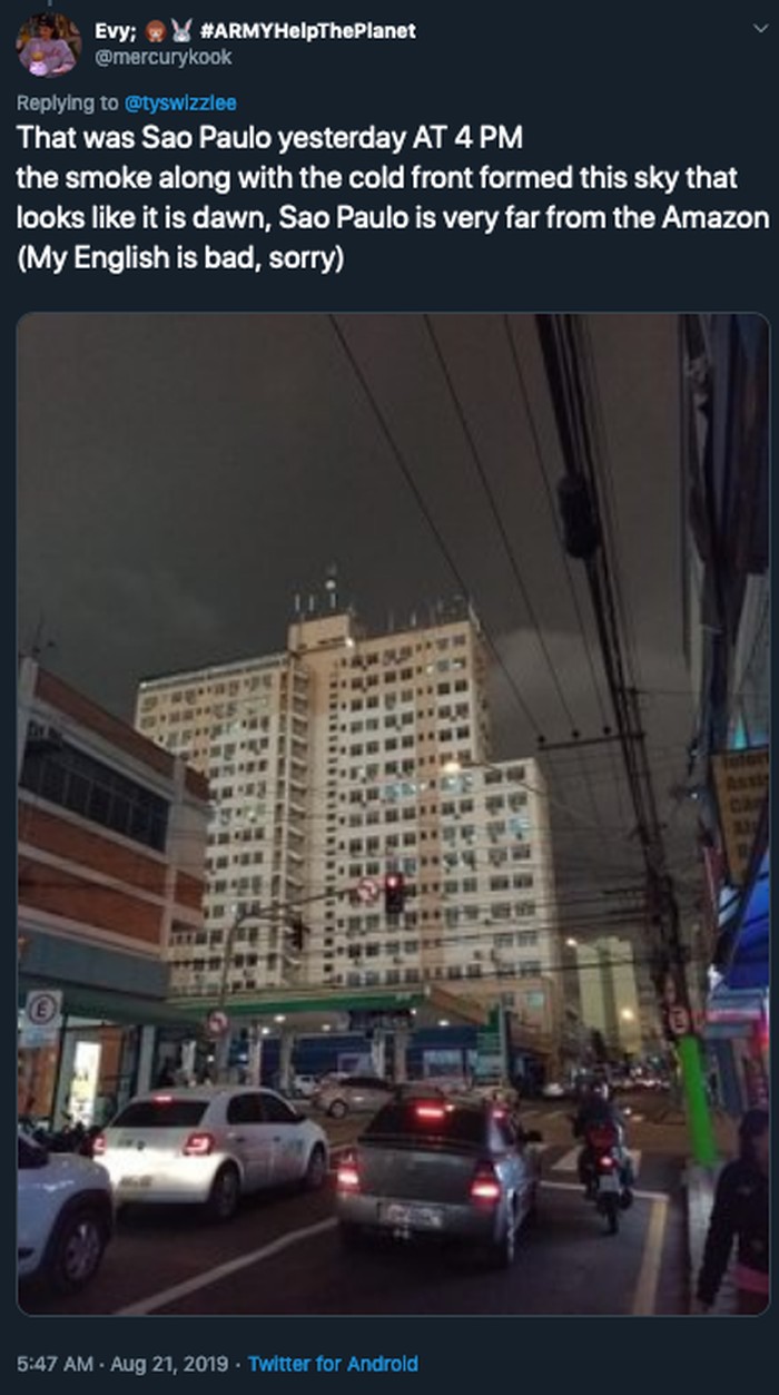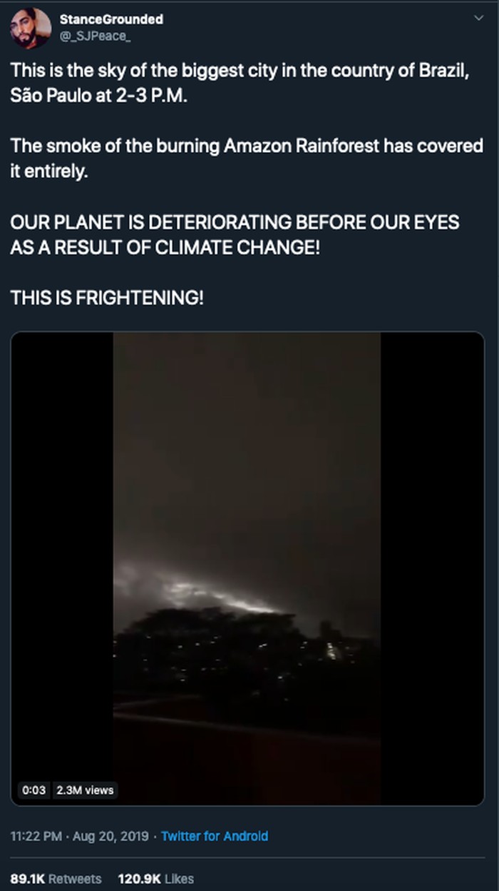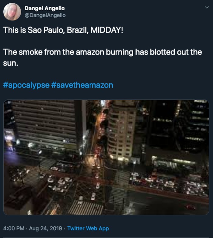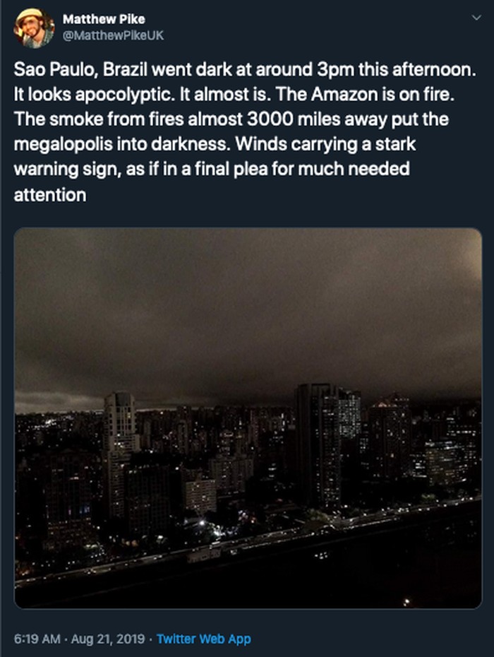 Netizen ini menyamakan Sao Paulo di sore hari sudah jadi seperti dini hari. Ia juga menegaskan jauhnya jarak kota itu dengan hutan Amazon. (Foto: Internet/Twitter)
