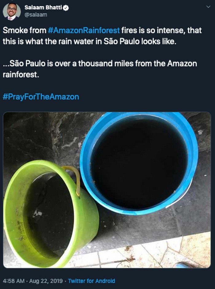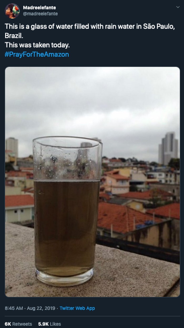 Sejumlah netizen juga membagikan foto hasil menampung air hujan di Sao Paulo, yang bercampur dengan asap. (Foto: Internet/Twitter)