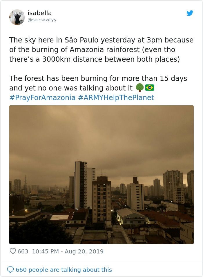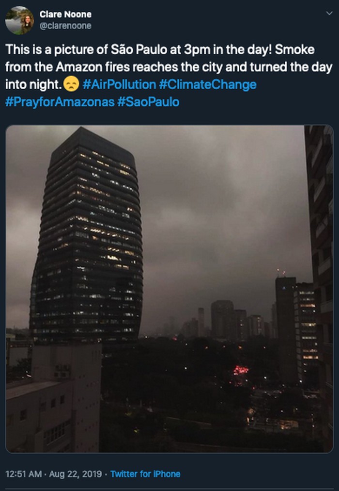 Sao Paulo ikut terimbas kebakaran hutan walaupun jaraknya dengan Amazon sebenarnya tidak bisa dibilang dekat. (Foto: Internet/Twitter)
