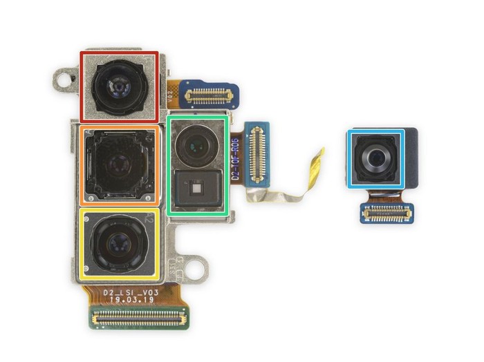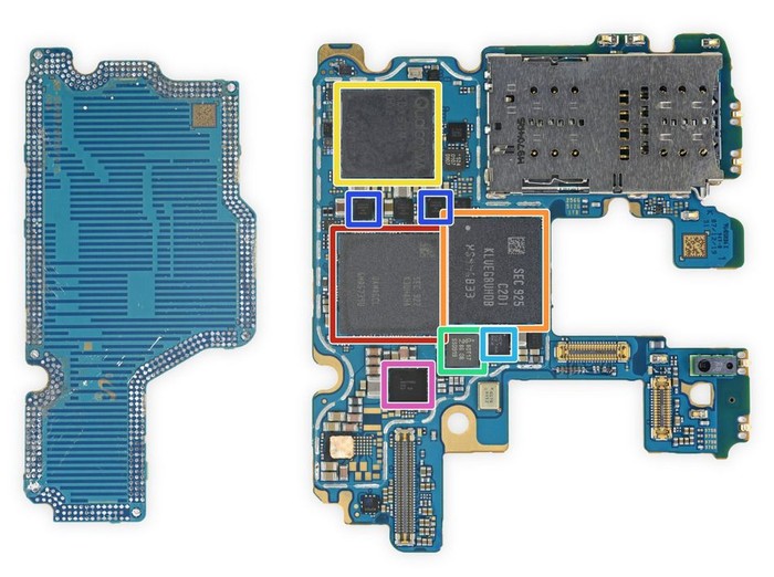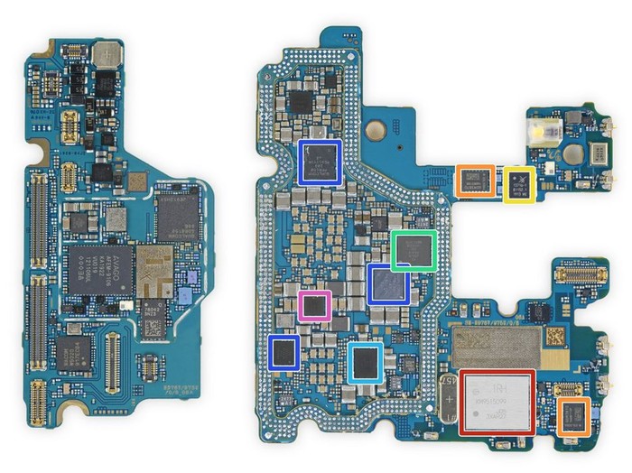 Ketika motherboard dibongkar. Merah adalah memori flash Samsung 12GB menyatu dengan Qualcomm Snapdragon 855 SoC; oranye adalah 256GB Samsung UFS 3.0 flash; kuning adalah Qualcomm 5G chip X50; dan NXP NFC controller (hijau); Semiconductor NCP59744 voltage regulator (biru muda); penguat audio (biru tua). Foto: ifixit