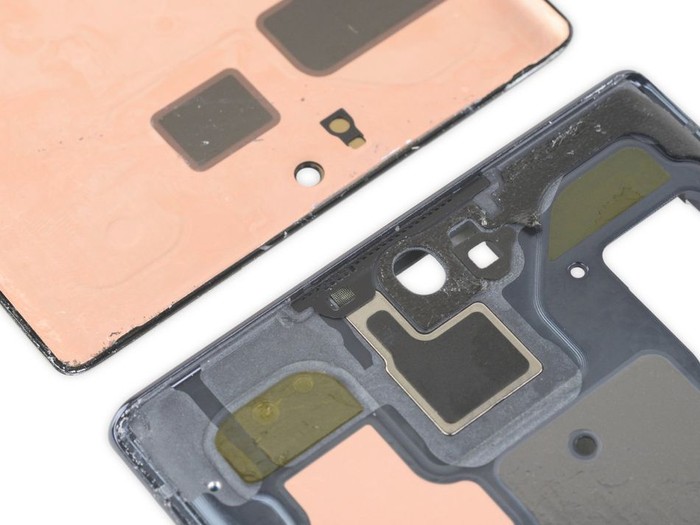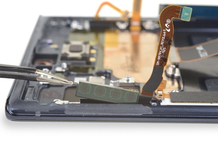 Sensor sidik jari ultrasonik yang mirip dengan S10 terpasang di bagian belakang. Foto: ifixit