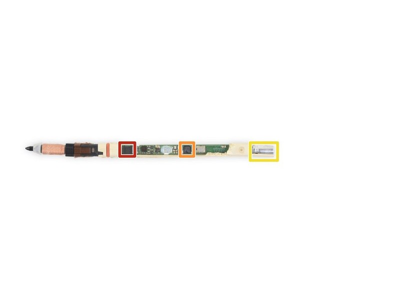 Di sebelah kanan adalah radio LTE Qualcomm (oranye), decoder audio Qualcomm (hijau), IC manajemen daya untuk modem X50 terintegrasi (PMIC, biru muda), PM8150 Qualcomm, PM8150C, dan PM8005 (mungkin PMIC, biru tua). Foto: ifixit