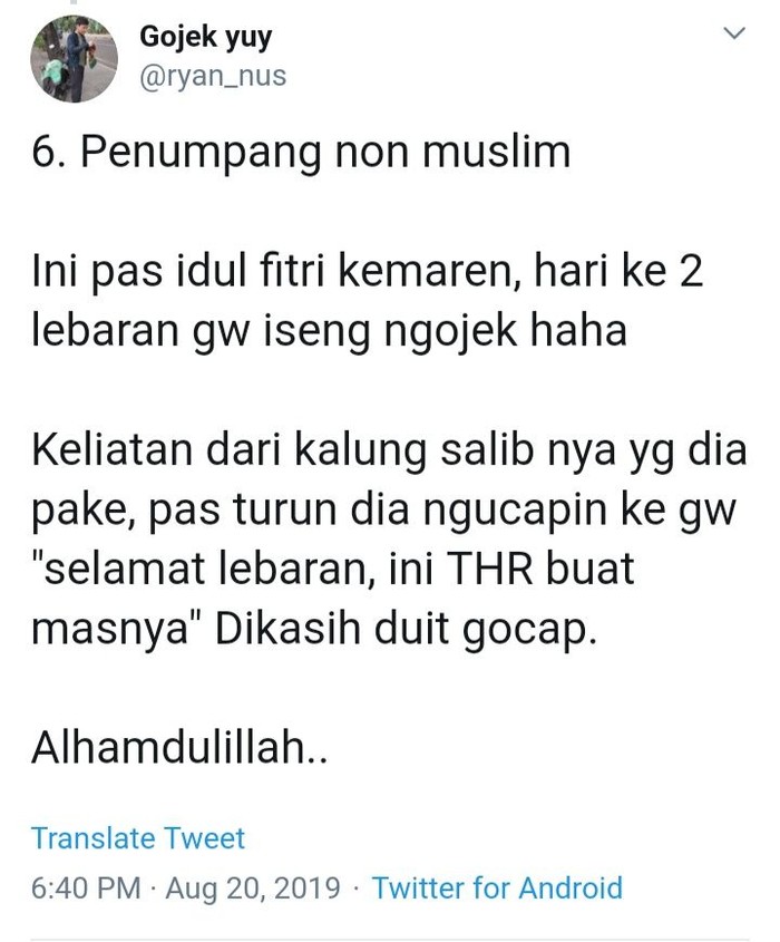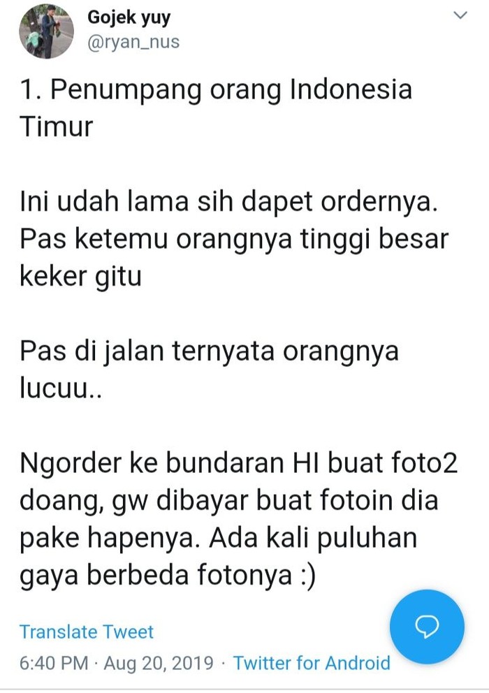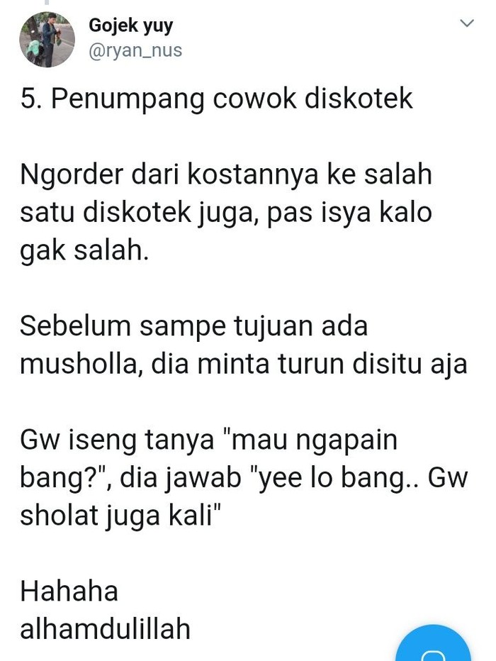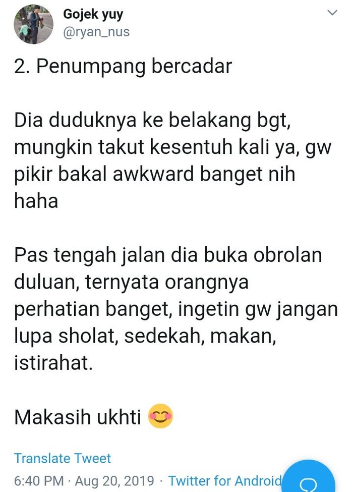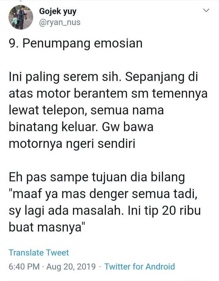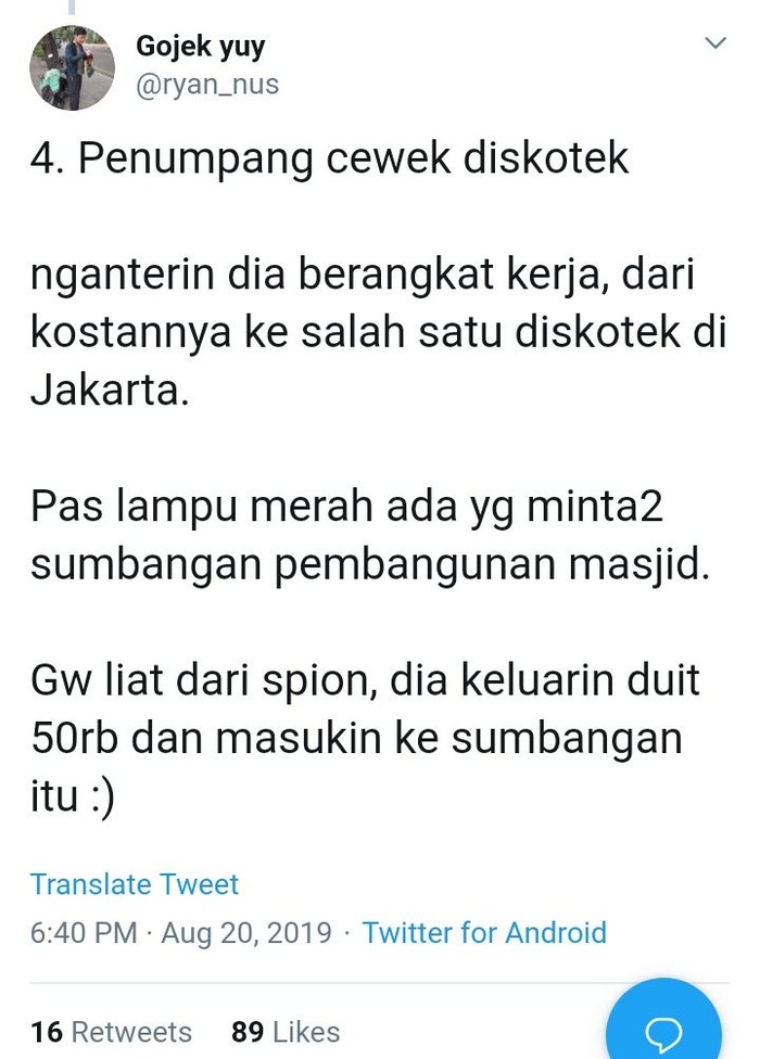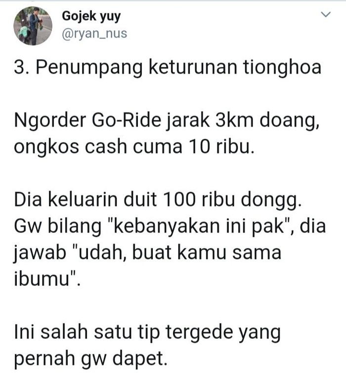 Menjadi abangΒ ojol tentu saja membuat driver sering bertemu banyak orang dengan berbagai karakter. Melalui akun Twitter @ryan_nus, pria ini menceritakan pengalamannya. (Foto: Twitter/ryan_nus)