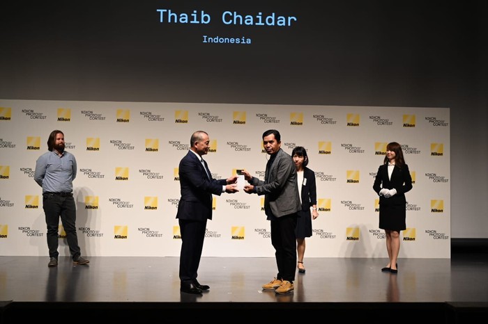 Saat Thaib menerima penghargaan yang diberikan petinggi Nikon di Tokyo, Jepang. Foto: doc Kristian Tjahjono