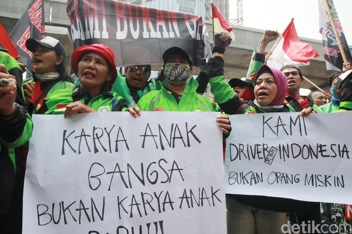 Massa driver Gojek menggelar aksi demo di depan Kedubes Malaysia di Jakarta. Mereka memprotes pernyataan bos Big Blue Taxi asal Malaysia.