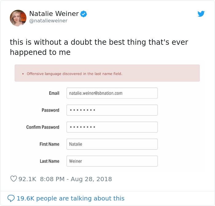 Netizen bernama Natalie Weiner ini curhat karena sulit bikin akun online akibat nama belakangnya yang jika diterjemahkan berarti "sosis", dengan makna slang berarti "kemaluan". (Foto: via Boredpanda.com)