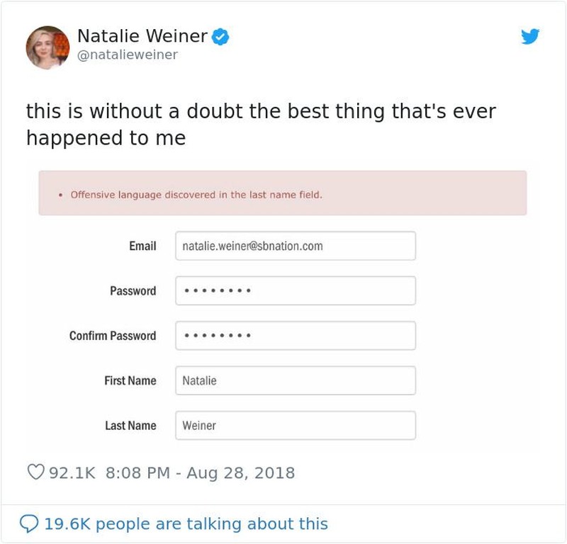 Netizen bernama Natalie Weiner ini curhat karena sulit bikin akun online akibat nama belakangnya yang jika diterjemahkan berarti "sosis", dengan makna slang berarti "kemaluan". (Foto: via Boredpanda.com)