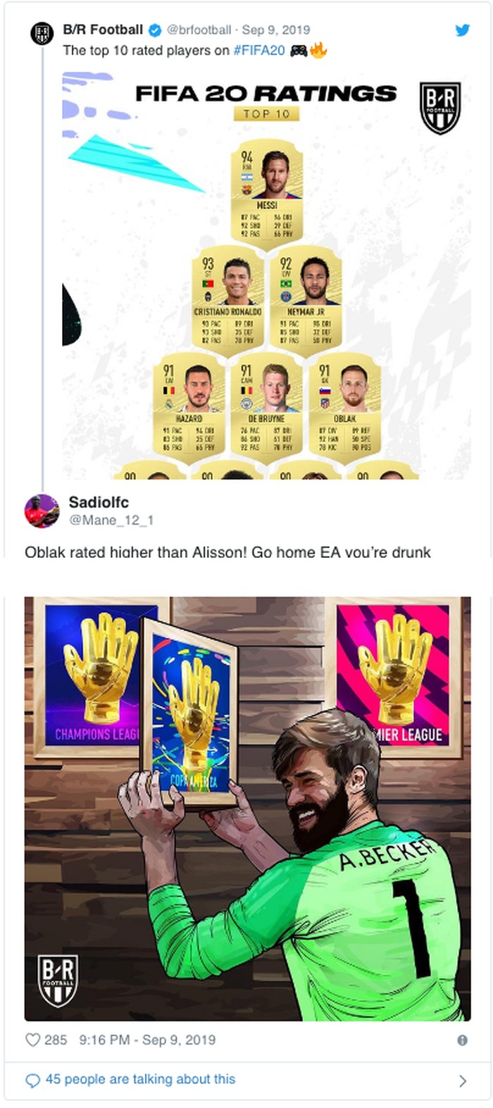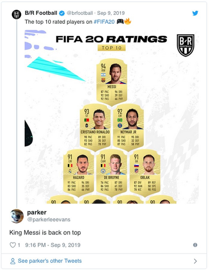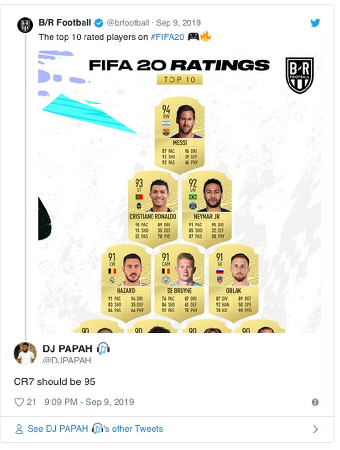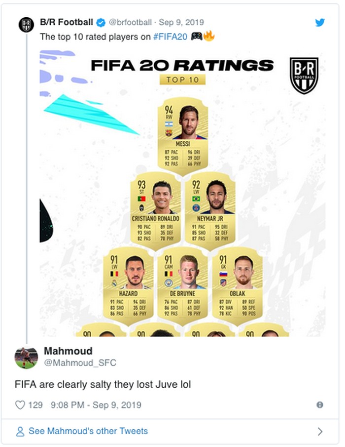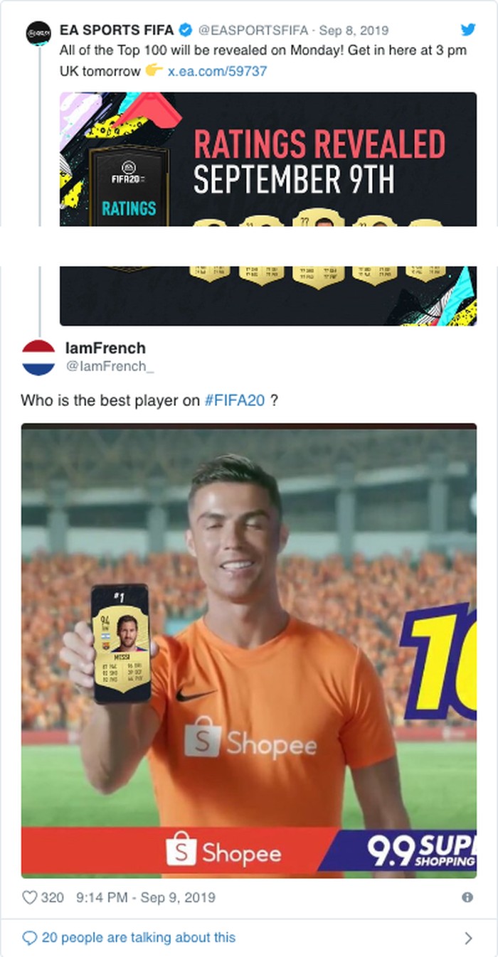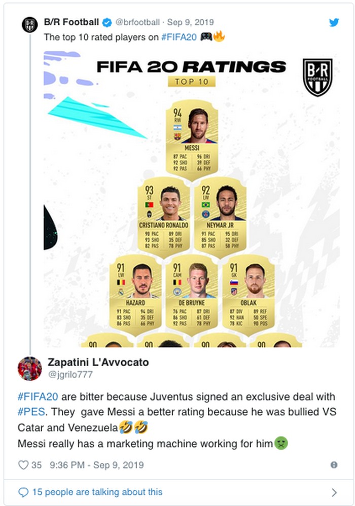 Ada pula yang menduga Ronaldo di bawah Messi karena EA kesal lisensi klub Juventus, tempat Ronaldo main, disambar game pesaing. (Foto: Internet/Twitter)