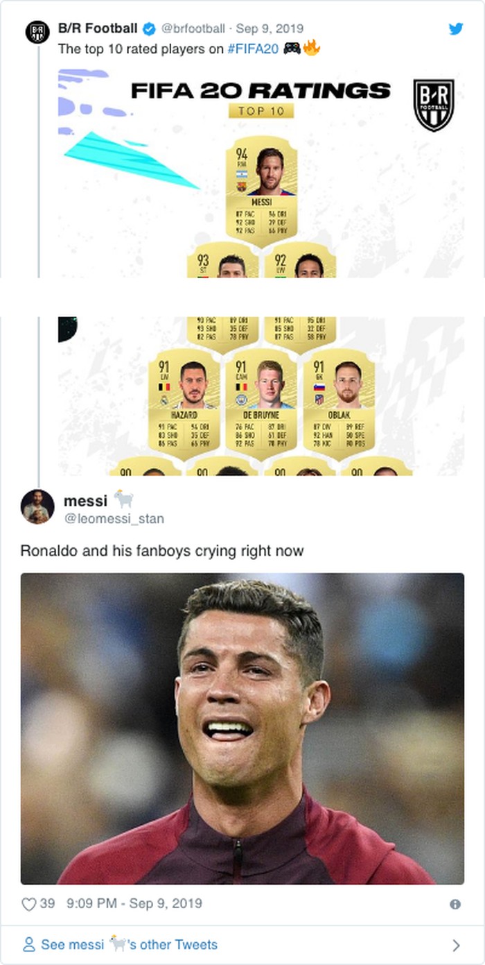 Ronaldo habis dibercandai akibat ratingnya yang di bawah Messi. (Foto: Internet/Twitter)
