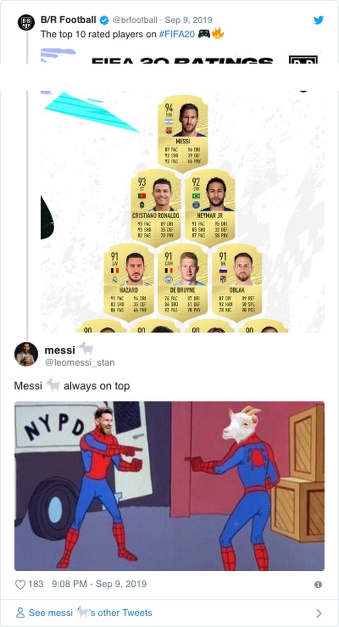 Lencana Messi sebagai pemain dengan rating tertinggi dipamerkan Ronaldo di meme ini. (Foto: Internet/Twitter)