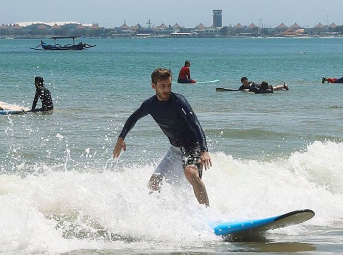PewDiePie juga berselancar. βAkhirnya bisa selancar untuk pertama kalinya di Bali. Aku suka,β tulisnya. Foto: Instagram
