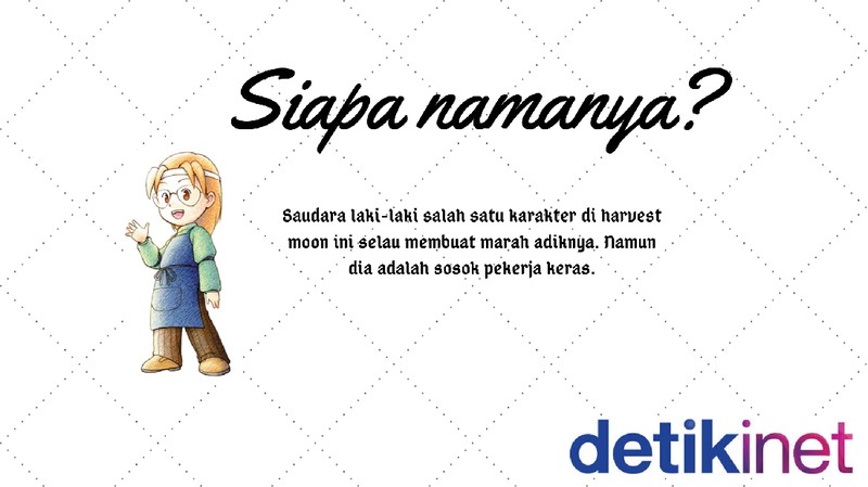 Ineters yang suka main Harvest Moon dari zaman dulu siapa coba acung jari! Kita ada soal apakah kalian masih ingat nama karakter mereka semua. Yuk tulis jawaban kamu di kolom komentar ya. Foto: Istimewa