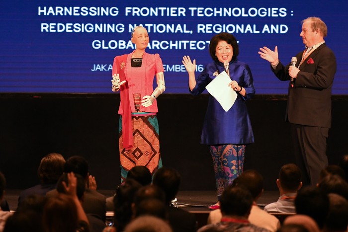 Kehadiran Sophia jadi daya tarik di gelaran Youth Dialogue 2019 yang diglar di Jakarta. Ia berbincang dengan Menkominfo Rudiantara. Foto: Agus Tri Haryanto/inet