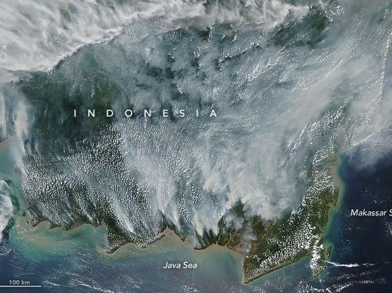 Foto-foto satelit NASA, dipajang di situs resmi NASA Earth Observatory. Tampak Pulau Kalimantan yang berselimut asap putih (dok NASA)