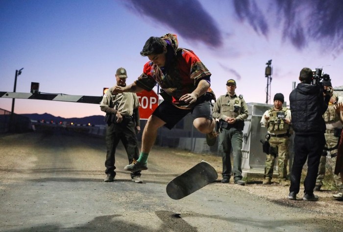 Seorang pemuda beraksi skate boar di hadapan aparat yang berjaga di depan area terlarang. Foto: Reuters