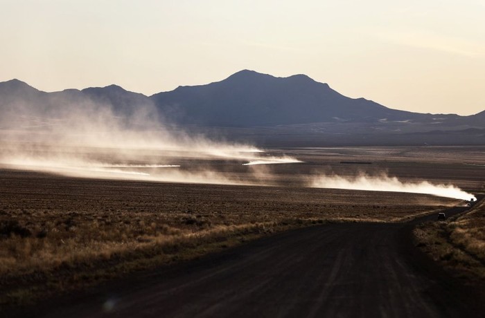 Debu beterbangan ketika mobil pengunjung melaju di antara gurun. Foto: Reuters