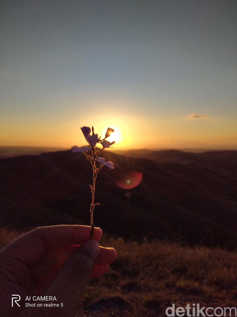 Kamera utama Realme 5 yang dilengkapi dengan 12 MP, mampu menangkap keindahan Bukit Tanarara yang berwarna coklat dan hijau pada luas dan birunya langit dengan indah. (Septiana Ledysia/detikINET)