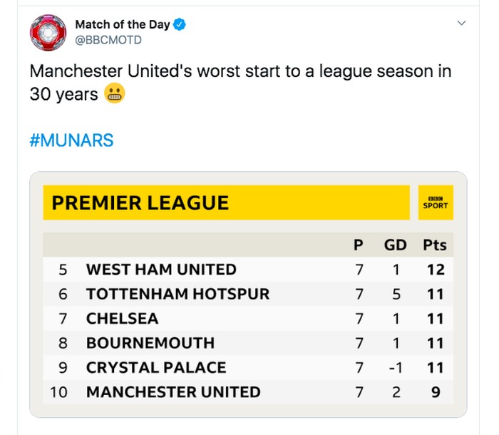 Konon posisi ke 10 adalah awal terburuk bagi MU selama 30 tahun. Foto: Twitter
