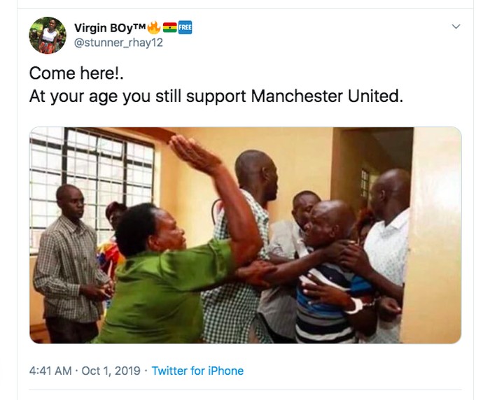 Sudah tua kok masih dukung MU? Foto: Twitter