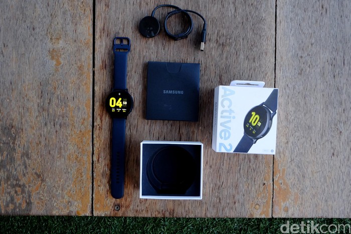 Isi dalam kemasan Galaxy Watch Active2. Ada jamnya, pengisi daay serta tentunya buku panduan. (Foto: Muhammad Ridho/detikcom)