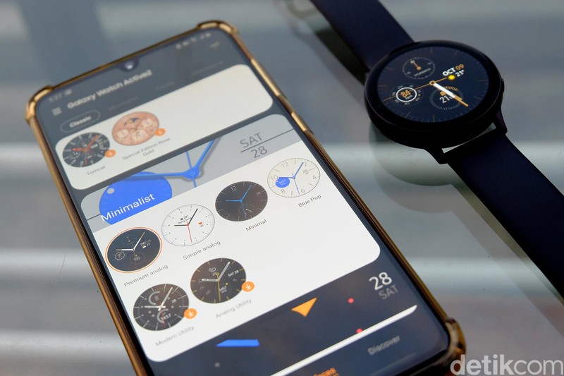 Pengguna juga dapat menyesuaikan watch face Galaxy Watch Active2 dengan pakaian via algoritma ekstraksi warna My Style. Tersedia di aplikasi Galaxy Wearable, ambil foto pakaian, pilih dari lima pola warna yang berbeda, dan tampilan jam berubah. (Foto: Muhammad Ridho/detikcom)