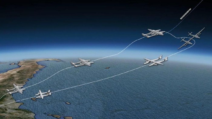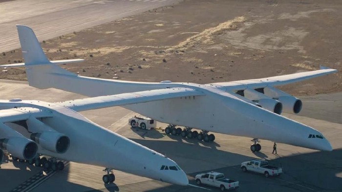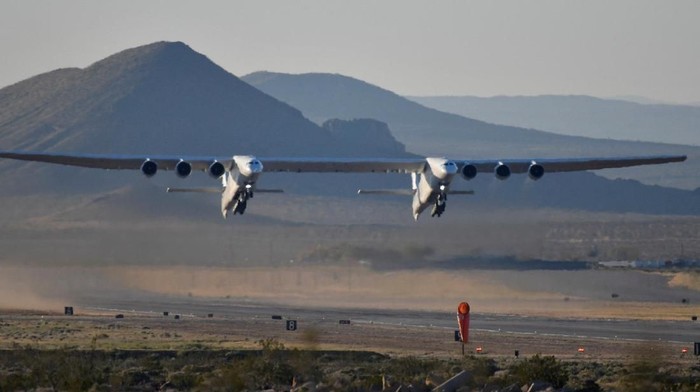 Pesawat terbesar sejagat akhirnya terbang perdana pada 13 April dari Mojave Air and Space Port di Mojave, California, Amerika Serikat. Penerbangan perdana itu berlangsung selama 150 menit, sampai akhirnya pesawat itu kembali mendarat dengan selamat. Foto: Istimewa/Youtube