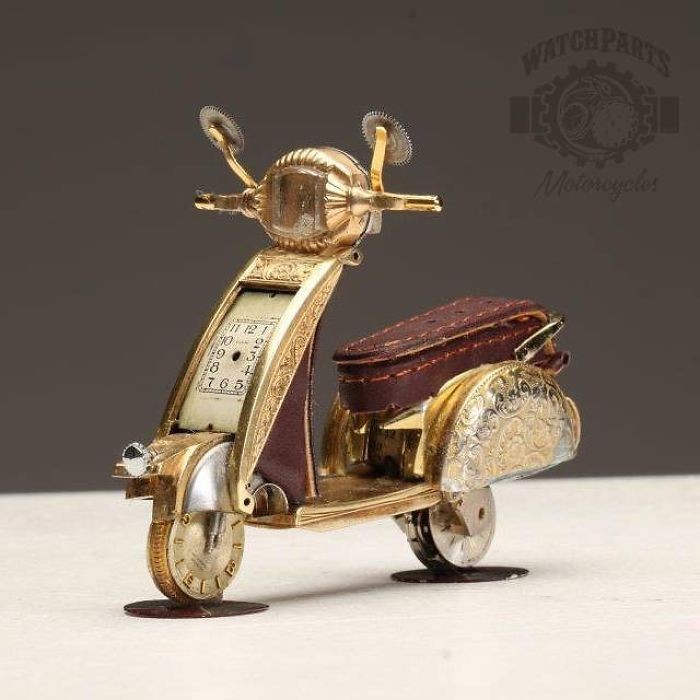 Di tempat kerjanya dengan potongan-potongan arlojinya tersebut ia mulai berkreasi seperti membuat sepeda motor mini. (Foto: Instagram/watchpartsmotorcycles)