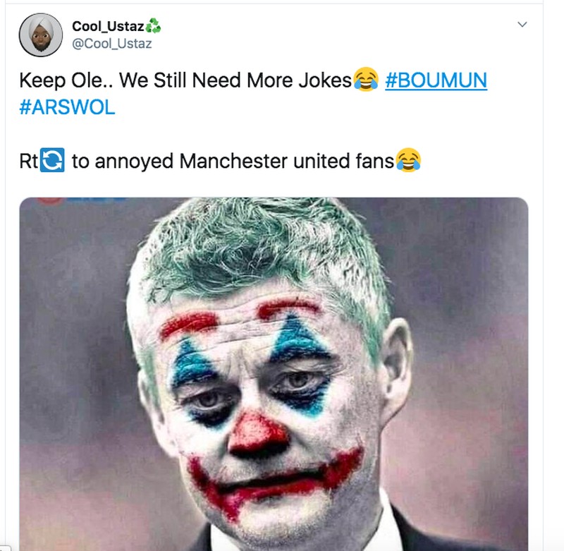 Manager part time, badut full time, demikian sindiran netizen pada Ole Gunnar Solskjaer. Foto: Twitter