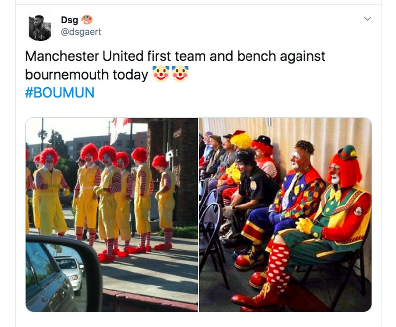 Tim inti maupun tim cadangan MU digambarkan sebagai badut. Foto: Twitter