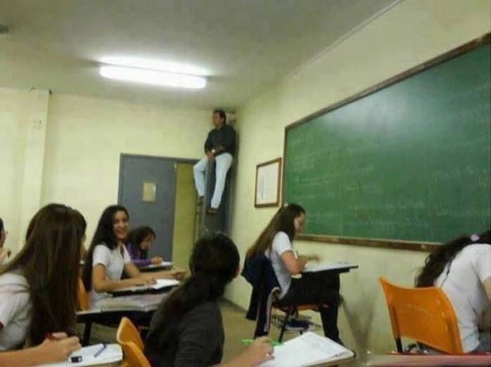 Sang guru sampai rela duduk di atas pintu agar semua terpantau. (Foto: Boredpanda