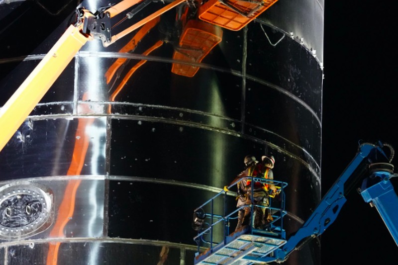 Tampak close up para pekerja menggarap prototipe Starship Mk1. Foto: Darrell Etherington via Tech Crunch