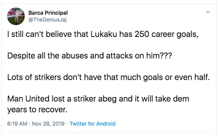 "Saya tidak percaya Lukaku telah mencetak 350 gol meskipun hinaan dan serangan menimpa dirinya. Banyak striker tak punya gol setinggi itu atai bahkan separuhnya. MU kehilangan striker hebat dan akan butuh waktu tahunan untuk pulih,". Foto: Twitter