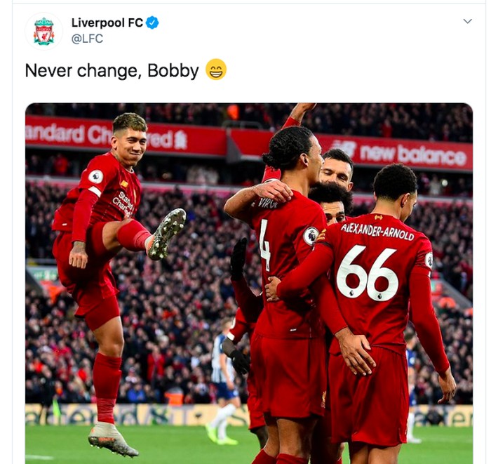 Roberto Firmino merayakan gol Virgil van Dijk dengan gaya menendang khasnya. Foto: istimewa