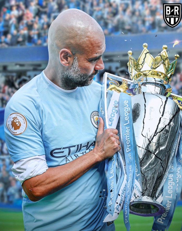 Pep Guardiola digambarkan memegang piala Liga Inggris yang sudah retak karena sangat terancam oleh Liverpool. Foto: istimewa