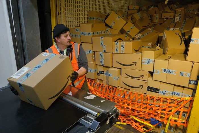 Tampak karyawan mengangkut banyak barang. Foto: Getty Images