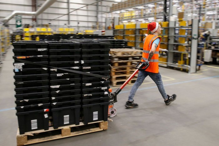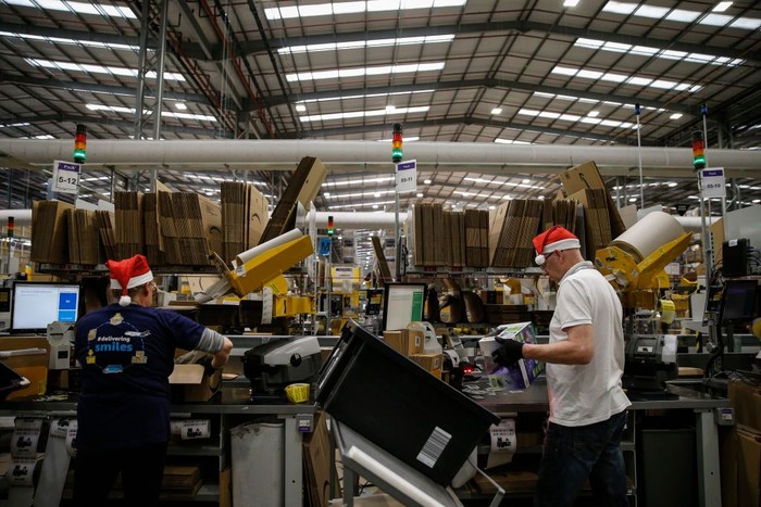 Karyawan gudang mengenakan pernak-pernik Natal sibuk mengatur arus barang yang dibeli konsumen ataupun masuk dalam stok. Foto: Getty Images