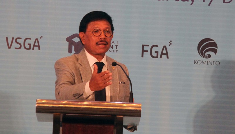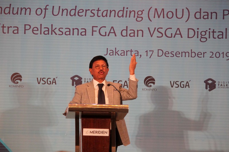Menteri Kominfo Johnny G Plate, memberikan sambutan dalam acara Penandatanganan Memorandum of Understanding (MoU) dan Perjanjian Kerja Sama (PKS) Fresh Graduate Academy (FGA) dan Vocational School Graduate Academy (VSGA) Digital Talent Scholarship (DTS) Tahun 2020 di Jakarta, Selasa (17/12/2019). Pool/Kominfo.