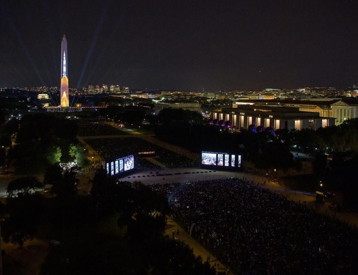 Apollo 11 di Washington Monument, Juli 2019. Peringatan 50 tahun misi Apollo 11 yang membawa astronot NASA Neil Armstrong, Michael Collins, dan Buzz Aldrin dirayakan dalam pertunjukan laser digital mapping selama 17 menit. Karya bertajuk 'Apollo 50: Go for the Moon' oleh National Air and Space Museum Smithsonian ini menembakkan gambar Apollo 11 ke Washington Monument untuk mengenang kembali peluncuran Apollo 11 dan kesuksesan kisah pendaratan di Bulan pertama. Foto: via Forbes