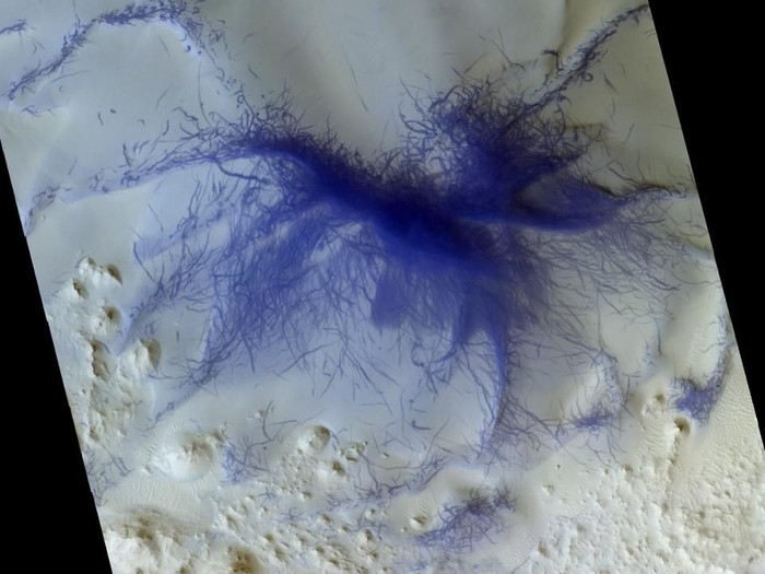 'Debu iblis', Februari 2019. Ini adalah penampilan Mars yang belum pernah terlihat sebelumnya. Yang tertangkap kamera adalah apa yang disebut 'debu iblis', memperlihatkan material baru. Tidak diketahui mengapa garis-garis tersebut hanya terkonsentrasi pada punggung bukit.Β Foto: via Forbes