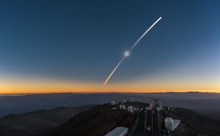 Urutan gerhana Matahari dari Observatorium La Silla, Juli 2019. Pemenang lain Astronomy Picture of the Day NASA saat gerhana Matahari Juli 2019 adalah Petr HorΓ‘lekh. Pada foto karya jepretannya, dia menunjukkan selang waktu dari total gerhana Matahari pada 2 Juli 2019 dari Observatorium La Silla ESO di Chili. Foto: via Forbes