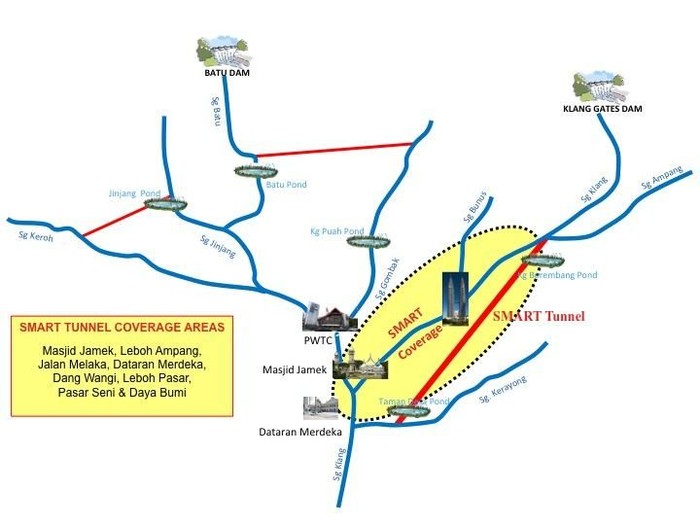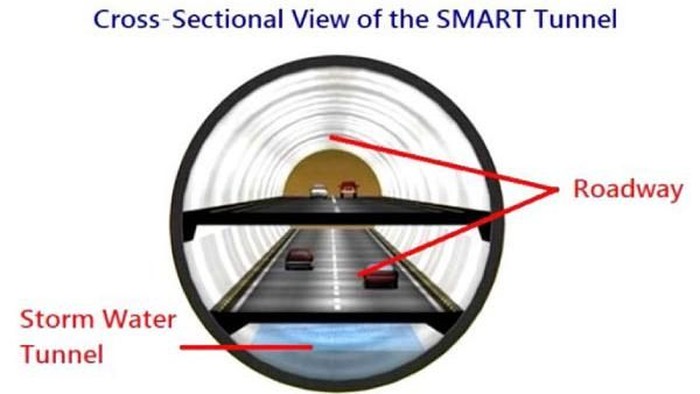 SMART Tunnel berfungsi sebagai sodetan panjang dan raksasa yang menghubungkan Sungai Klang di tengah kota dengan Sungai Kerayong di pinggir kota Kuala Lumpur. Dari situ, air banjir masuk lagi ke Sungai Klang lalu dialirkan ke laut di Port Klang. (SMART Tunnel)