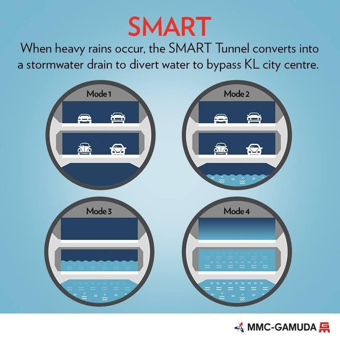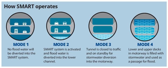 4 Mode penggunaan SMART Tunell. Pertama, semua dipakai jalan tol, tingkat bawah kosong. Kedua, tingkat bawah untuk air, tengah dan atas tetap jadi jalan tol. Ketiga, tingkat bawah dan tengah untuk air, yang atas kosong. Keempat, semua tingkat dipakai untuk gorong-gorong (SMART Tunnel/MMC-Gamuda)