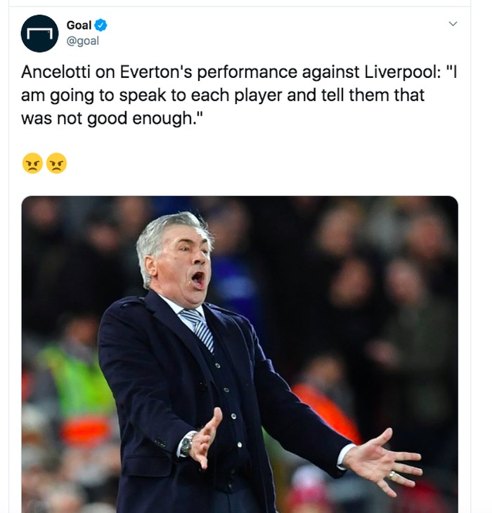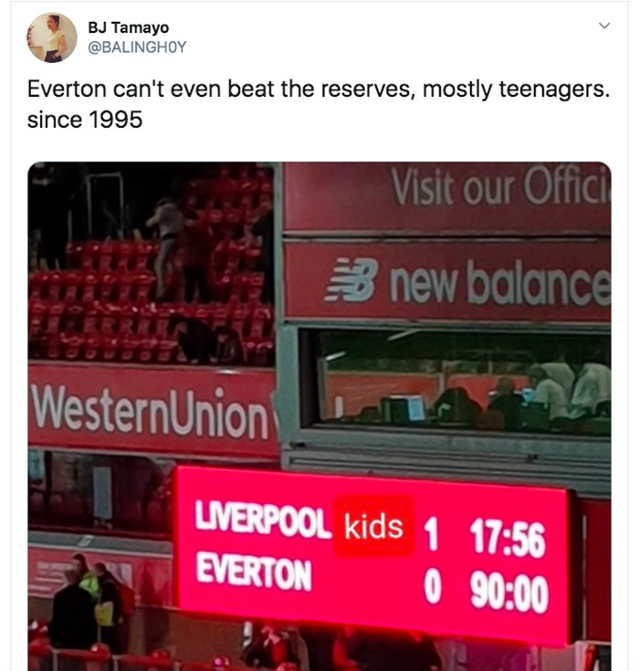 FotoINET Meme Lucu 'Bocah' Liverpool Kandaskan Everton Istimewa - detikInet Senin, 06 Jan 2020 11:04 WIB Tautan telah disalin Jakarta - Mengerahkan tim 'anak-anak', Liverpool sukses mengandaskan Everton di Piala FA. Meme pun bertebaran. Jurgen Klopp memberi selamat pada para bocah Liverpool yang mengalahkan Everton. Foto: Twitter Pemain Liverpool merayakan gol Curtis Jones ke gawang Everton. Foto: Twitter Dua pemain Liverpool digambarkan hadir bersama Pierce Brosnan di ajang Golden Globe hari ini. Foto: Twitter Netizen ini menguraikan Liverpool benar-benar tampil tanpa kekuatan utama dan tetap menang. Foto: Twitter Hanya blunder Karius yang bisa menghentikan Liverpool. Foto: Twitter Bill Shankly sang pelatih legendaris Liverpool mengatakan kota Liverpool punya dua tim hebat yaitu Liverpool dan tim cadangannya. Foto: Twitter Usia para pemain Liverpol yang bertanding semalam sangat muda. Foto: Twitter Dalam 25 pertandingan terakhir di Anfield, Liverpool menang 23 kali. Foto: Twitter Betapa jauh gap total nilai pemain Liverpool semalam dengan Everton yang menurunkan tim utamanya. Foto: Twitter Pemain Liverpool merayakan kemenangan di ruang ganti. Foto: Twitter Ancelotti jelas kecewa berat dan berencana akan memarahi pemain Everton satu demi satu. Foto: Twitter Liverpool Kids berhasil menang lawan Everton. Foto: Twitter (/) TAGS meme liverpool LIHAT LAINNYA Tautan telah disalin