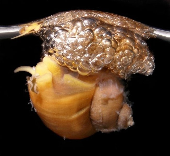 Jenis siput bubble rafting brown janthina, Recluzia cf. jehennei. Siput ini menjalani kehidupannya dengan terbalik dan mengapung di atas gelembung lendir. Para peneliti percaya gelembung tersebut berevolusi dari massa telur yang mengambang. Foto:Β Denis Riek via Livescience
